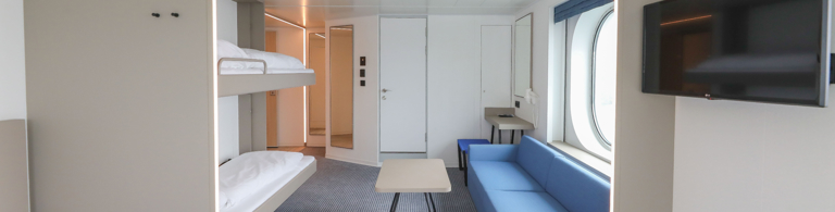 Insgesamt 239 moderne und komfortable Kabinen in unterschiedlichen Kategorien stehen unseren Passagieren auf dem neuen Green Ship zur Verfügung. Jede Kabine ist unter anderem mit einem Fernseher, Haartrockner und ausreichend Steckdosen ausgestattet. Die besonders geräumigen Außenkabinen verfügen über große Fensterfronten und ermöglichen so einen hervorragenden Blick auf die Ostsee.