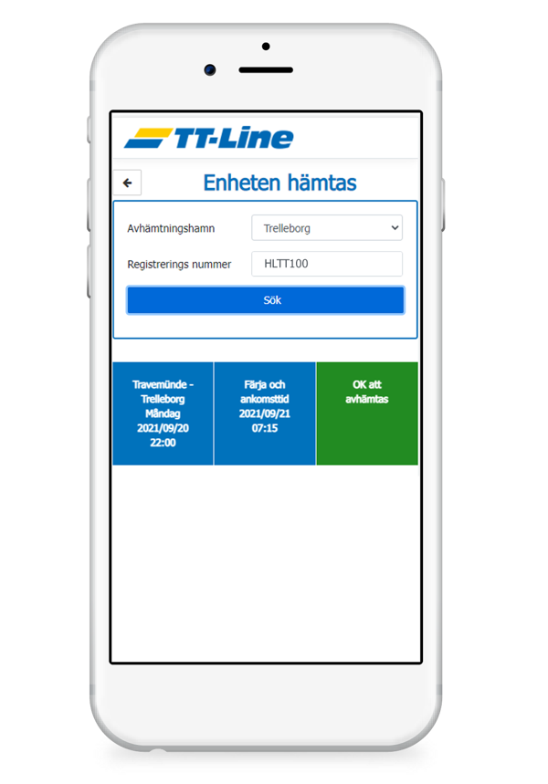 'Freight pick-up är den digitala lösningen för att hämta transportenheter efter leverans med TT-Line. Lösningen är tillgänglig för dig på flera enheter och på mer än 20 språk, vilket ger dig maximal flexibilitet. Välj bara önskad ankomsthamn och ange registreringsnumret. Nu kan du se om din transportenhet är redo för upphämtning.